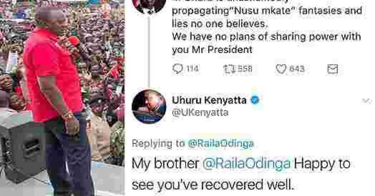 Raila Odinga’s Tweet read: "Uhuru is unashamedly propagating 'Nusu mkate' fantasies and lies no one believes. We have no plans of sharing power with you Mr President.", which President Uhuru replied saying, "My brother Raila Odinga Happy to see you've recovered well."