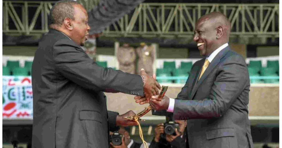 Kenyatta, who was accompanied by Chief of Defense Forces Robert Kibochi, handed over the 2010 constitution and the ceremonial sword to Kenya's fifth president in a brief ceremony at Kasarani Stadium.
